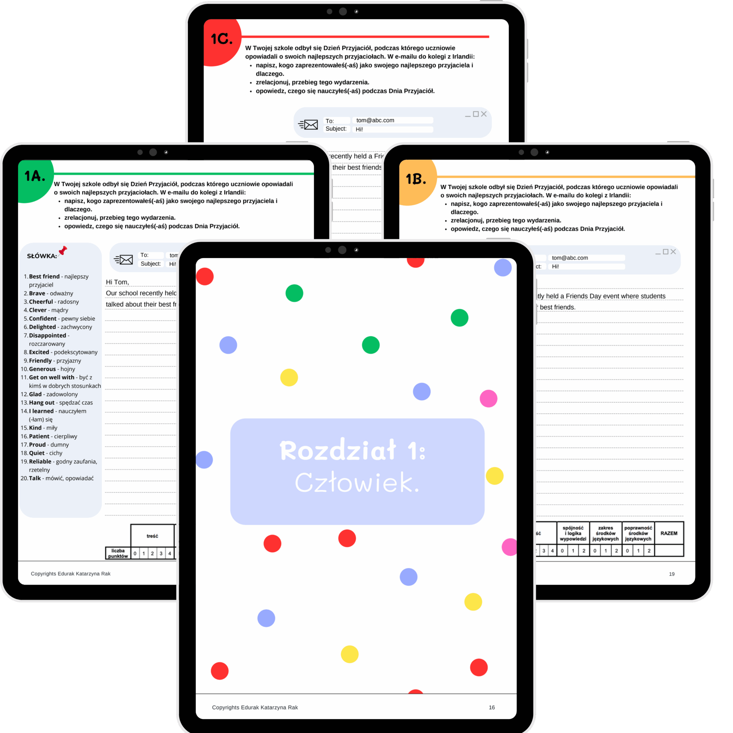 "Zrobiła Pani kawał dobrej roboty. Dowiozła Pani obiecany efekt - te ebooki naprawdę zaoszczędzą mi masę czasu. Są zrobione bardzo rzetelnie i starannie. Naprawdę się Pani postarała. Naprawdę się Pani postarała. Trzy wersje każdego maila to świetny pomysł na indywidualizację zajęć, stosownie do możliwości uczniów. Grafika przemyślana (oznaczenie kolorami poszczególnych poziomów), czytelna i przejrzysta. Ciekawe tematy - z pewnością ułatwią uczniom wypowiedź. Moje pierwsze wrażenie jest bardzo dobre. Materiały z przyjemnością wykorzystam z uczniami we wrześniu."